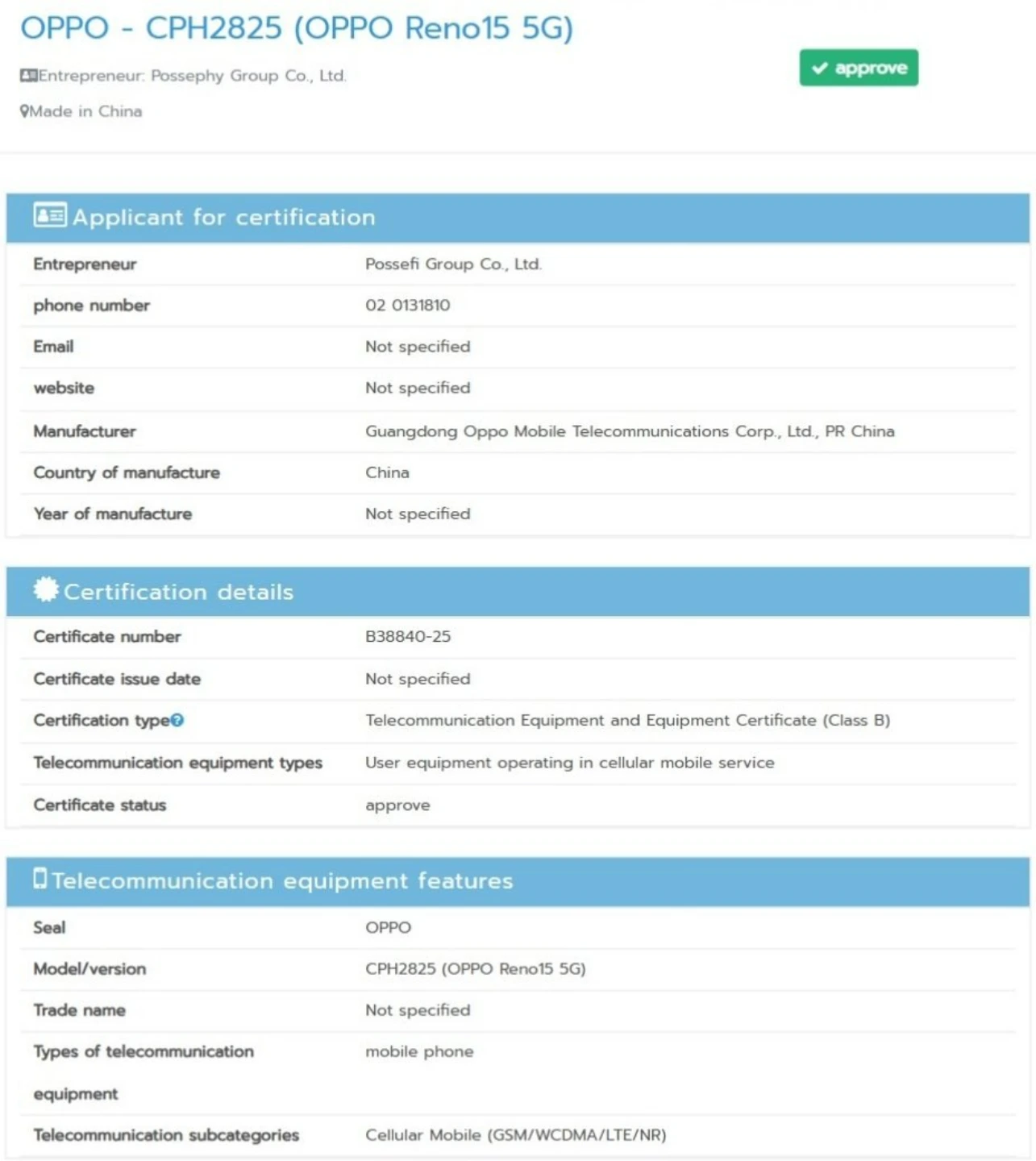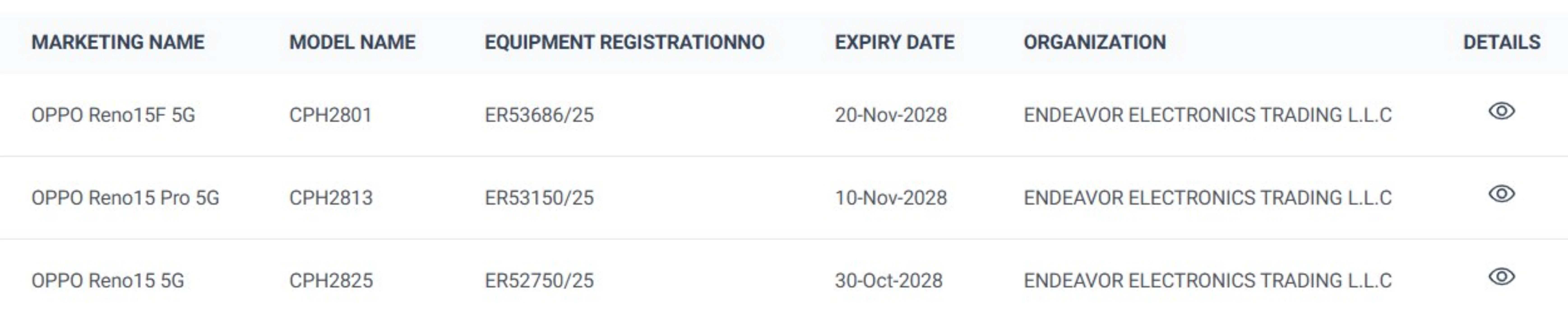 طبق داده‌های منتشرشده، سری رینو ۱۵ در بازار جهانی شامل این نسخه پایه با شماره مدل CPH2825، نسخه F با شماره مدل CPH2801، نسخه پرو با شماره مدل CPH2813 و نسخه پرومکس با شماره مدل CPH2811 می‌شود. اسکرین‌شات‌های منتشرشده نشان می‌دهد که NBTC تایلند سه مدل رینو ۱۵، رینو ۱۵ پرو و رینو ۱۵ پرو مکس را تأیید کرده است، اما تأییدیه رینو 15f هنوز صادر نشده.