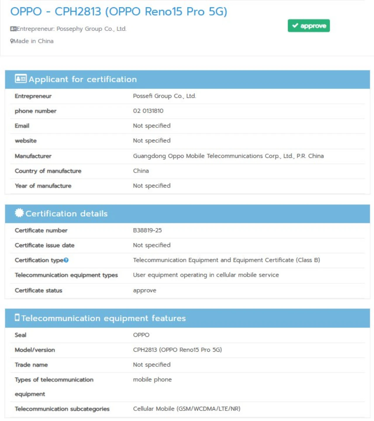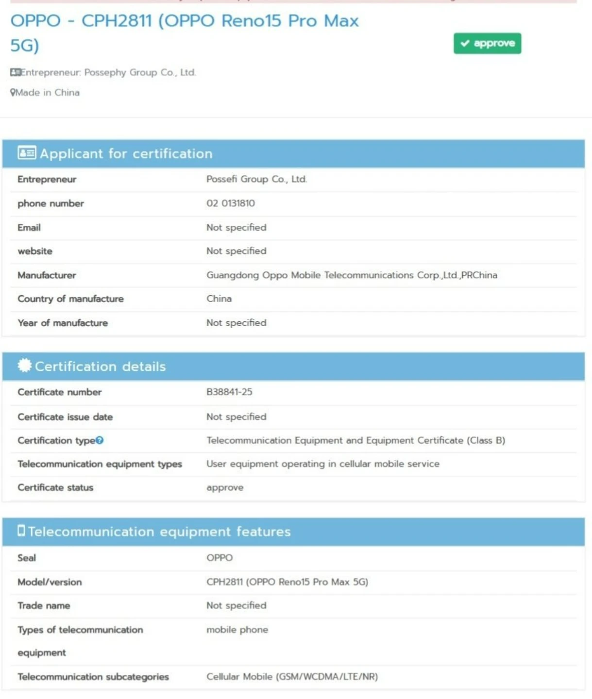 در سمت دیگر، نهادهای EEC اروپا، TDRA امارات و پلتفرم TUV سه مدل عادی، پرو و F را تأیید کرده‌اند، اما هنوز مجوز مدل بالاتر را صادر نکرده‌اند. اطلاعات موجود در تأییدیه TDRA همچنین نشان می‌دهد که تمامی این دستگاه‌ها از شارژ سیمی با توان ۸۰ وات پشتیبانی خواهند کرد.