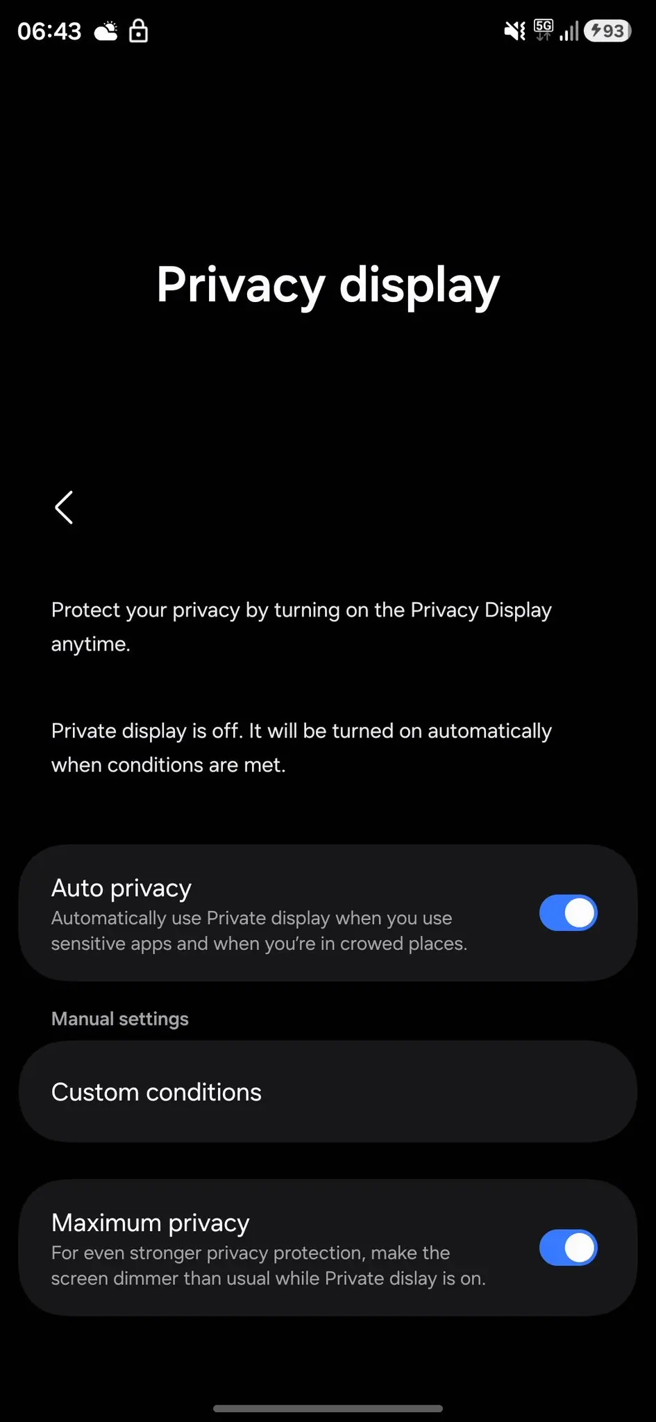 طبق گزارش 9to5Google، این اسکرینشاتها نخستین بار در ماه اکتبر منتشر شده بودند اما اخیراً بدون ذکر منبع اصلی دوباره بازنشر شدهاند. محتوای تصاویر نشان میدهد سامسونگ قصد دارد هنگام عرضه، گزینههای شخصیسازی متعددی ارائه دهد که یکی از این تنظیمات امکان فعال شدن نمایشگر حریم خصوصی را تنها در مکانهای عمومی برای کاربر فراهم میکند.