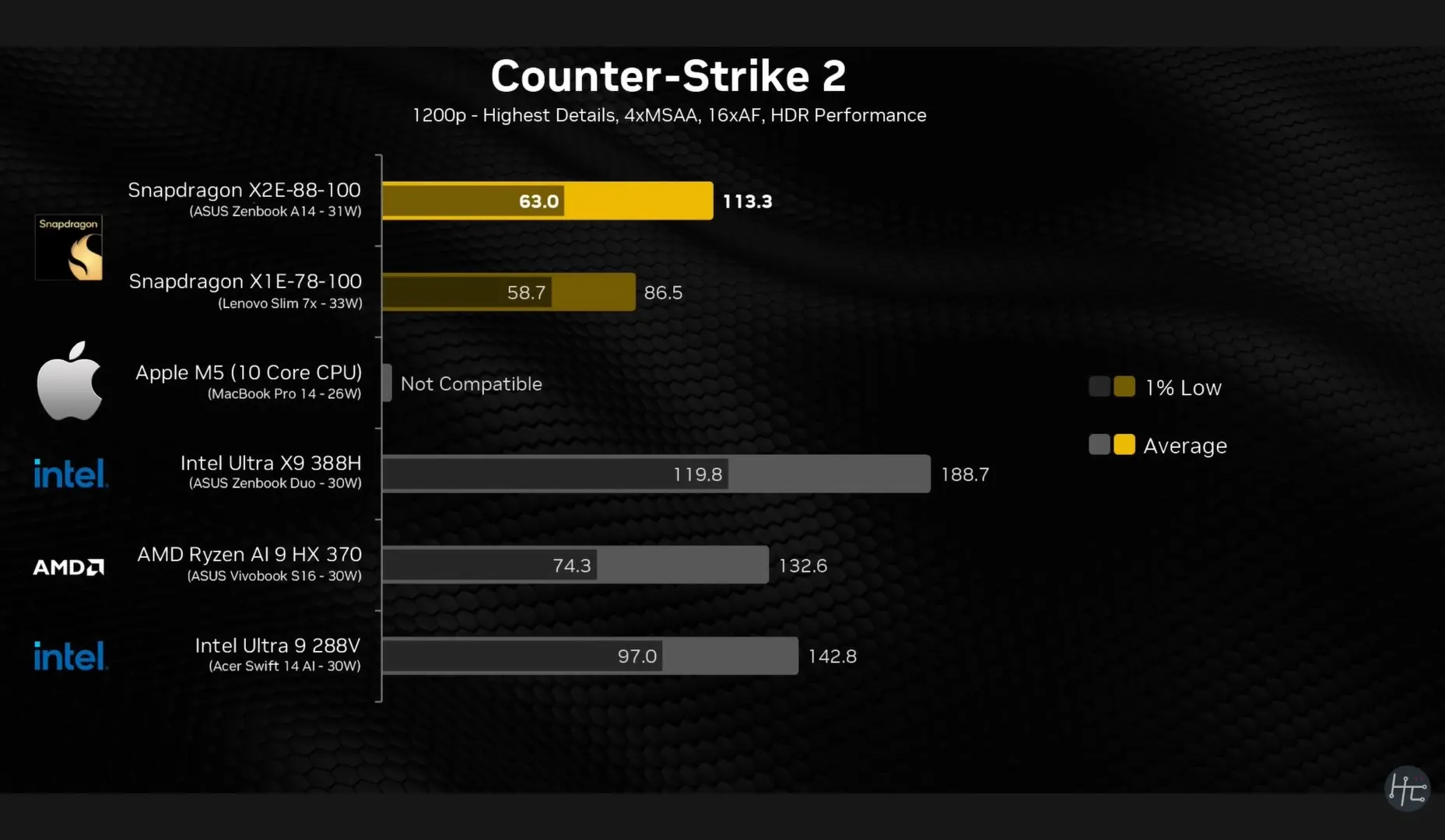 همین الگو در Counter Strike 2 نیز تکرار میشود. Snapdragon X2 Elite میانگین بیش از ۱۱۳ فریمبرثانیه ارائه میدهد، اما 1% Lows روی ۶۳ فریم باقی میماند. این در حالی است که Core Ultra X9 388H میانگین ۱۸۸.۷ فریمبرثانیه و 1% Lows برابر با ۱۱۹.۸ فریمبرثانیه ثبت میکند. این تفاوت، ضعف پایداری عملکرد کوالکام را کاملاً برجسته میسازد.