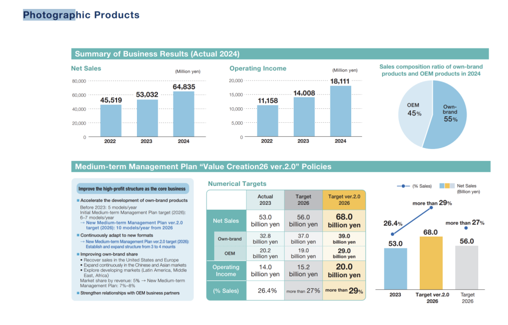 با این حال، شرکت به فروش ۹۰ میلیارد ین و سود عملیاتی ۱۹.۵ میلیارد ین نیز دست یافته که نشان از رشد قابلتوجه دارد. در برنامههای آینده، تامرون قصد دارد محصولات عکاسی با برند خود را در اروپا، آمریکا و چین گسترش دهد. این شامل معرفی لنزهای جدیدی مانند 16-30mm f/2.8 VXD G2 و 18-300mm f/3.5-6.3 VC VXD میشود. همچنین، این شرکت همچنان به عرضه چندین لنز در سال ادامه خواهد داد. طبق گزارش: «برنامه اولیه مدیریت میانمدت هدفگذاری کرده بود ۶ تا ۷ مدل جدید در سال عرضه شود که در همان سال اول، ۷ مدل به بازار آمد. در برنامه جدید، هدف عرضه ۱۰ مدل جدید در سال تا سال ۲۰۲۶ تعیین شده است.»