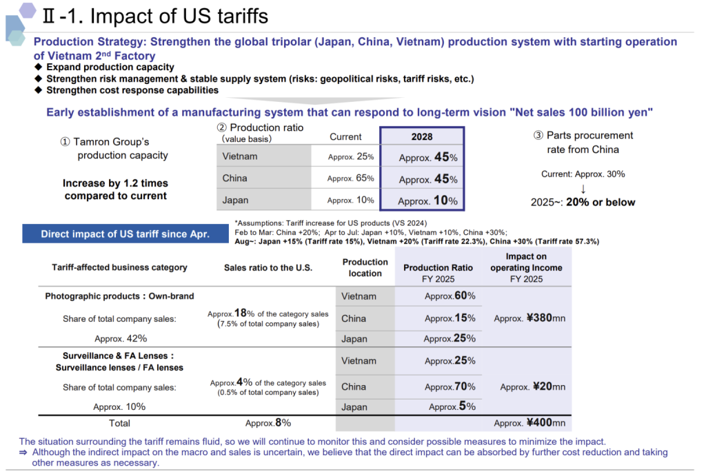 تامرون اعلام کرده که کندی بازار در اروپا، آمریکا و چین، رشد فروش در ژاپن و هند را نیز تحت تأثیر قرار داده است. همچنین کاهش سفارش برای مدلهای OEM به دلیل عملکرد بازار و تعرفههای آمریکا، بخشی از این افت را رقم زده است. تنها در نیمه اول سال، ۶۵۰ میلیون ین از فروش خالص و ۳۵۰ میلیون ین از سود عملیاتی کاسته شده است.