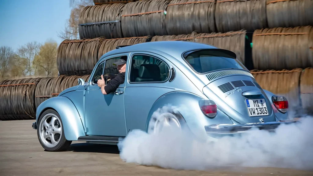 در نگاه اول فولکسواگن بیتل ۱۳۰۳ با رنگ Marathon Blue کاملاً عادی به نظر میرسد، اما کافی است کمی دقیقتر شوید. بدون شنیدن کوچکترین صدای موتور، چرخهای عقب شروع به هرزگردی میکنند، دود لاستیک بالا میرود و ذرات لاستیک روی آسفالت پخش میشود. این بیتل سادهنما، در واقع یک هیولای پنهان با شخصیتی کاملاً متفاوت است.