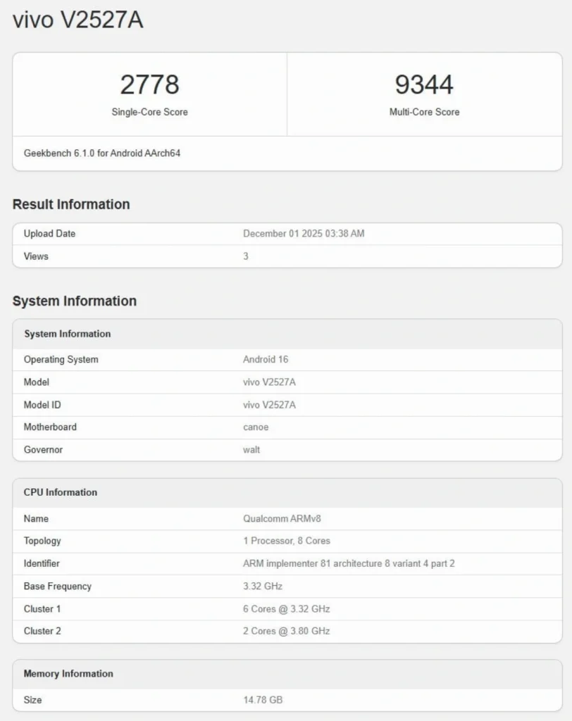 ویوو قبلاً تأیید کرده که این مدل از تراشه اسنپدراگون ۸ نسل ۵ استفاده خواهد کرد و لیست گیکبنچ این موضوع را با سرعتهای یکسان CPU تأیید میکند. گوشی با سیستم عامل Android ۱۶ و رم ۱۶ گیگابایت ثبت شده و امتیاز تک هستهای ۲,۷۷۸ و چند هستهای ۹,۳۴۴ را کسب کرده.
