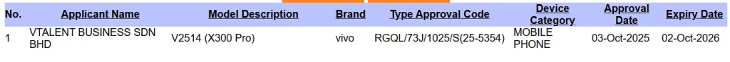 طبق اطلاعات ویوو X300 Pro با شماره مدل V2514 توسط مرجع SIRIM تأیید شده است. ماه گذشته همین دستگاه با تراشه دایمنسیتی ۹۵۰۰، حافظه ۱۶ گیگابایتی و اندروید ۱۶ در گیک‌بنچ دیده شده بود. از نظر گواهی‌ها نیز V2514 موفق به دریافت تأییدیه کمیسیون اقتصادی اوراسیا (EEC) و همچنین پلتفرم‌های TKDN و SDPPI اندونزی شده است.