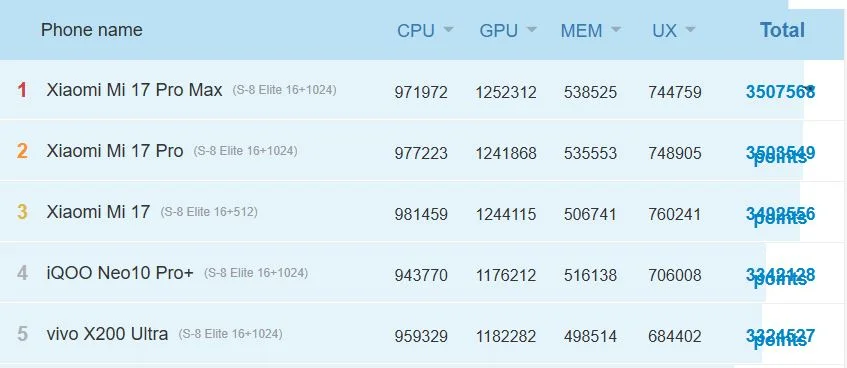 در نمودار رسمی آنتوتو، امتیاز CPU مدل شیائومی ۱۷ برابر با ۹۸۱٬۴۵۹ اعلام شده؛ عددی که بهخودیخود چشمگیر است اما تنها حدود ۳ درصد بالاتر از ویوو ایکس ۲۰۰ اولترا (با امتیاز ۹۵۹٬۳۲۹) قرار میگیرد، در حالیکه آن مدل از تراشه اسنپدراگون ۸ الیت سال گذشته استفاده میکند. از طرفی، مدلهای ۱۷ پرو و ۱۷ پرو مکس حتی امتیاز پایینتری از نسخه پایه ثبت کردهاند.