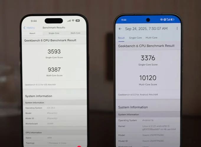 در گیکبنچ هم نتایج مشابهی دیده میشود. در حالیکه پیش از رونمایی رسمی، شیائومی ۱۷ در فهرستهای اولیه امتیاز حدود ۳۷۰۰ در تکهسته و ۱۱۰۰۰ در چندهسته کسب کرده بود، تستهای عملی از اعداد پایینتر خبر میدهند. دستگاه بررسیشده در Ben’s Gadget Reviews امتیازهای ۳۳۷۶ و ۱۰۱۲۰ گرفته، در حالیکه Sahil Karoul به ۳۳۲۸ و ۱۰۲۱۰ رسیده و Mrwhosetheboss نیز ۳۴۰۷ و ۱۰۴۱۶ را ثبت کرده است.