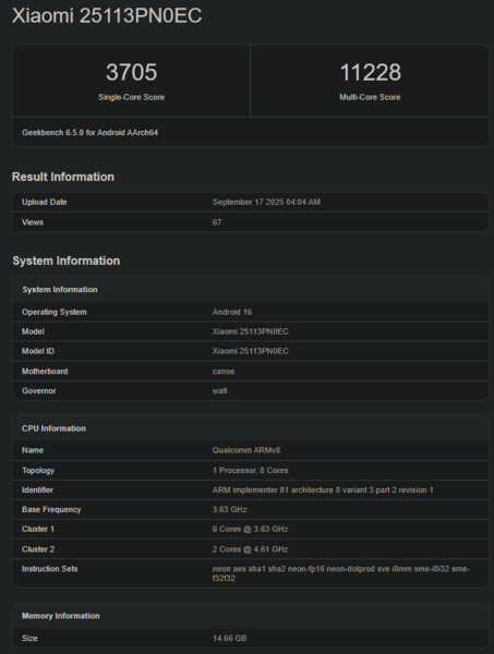 لیست Geekbench ۶.۴ این تراشه را به مدلی از شیائومی با نام رمز 25113PN0EC مرتبط کرده که احتمالاً همان شیائومی ۱۷ استاندارد است. نمونه آزمایشی دارای ۱۶ گیگابایت رم و سیستمعامل اندروید ۱۶ بوده است. از نظر عددی، دستگاه در تست تکهستهای به ۳,۷۰۵ امتیاز و در تست چندهستهای به ۱۱,۲۲۸ امتیاز رسید. این یک پیشرفت قابل توجه نسبت به نتایج قبلی است، جایی که همین تراشه نمیتوانست از ۳,۰۰۰ در تکهسته عبور کند و در چندهستهای حدود ۹,۱۰۰ باقی میماند.