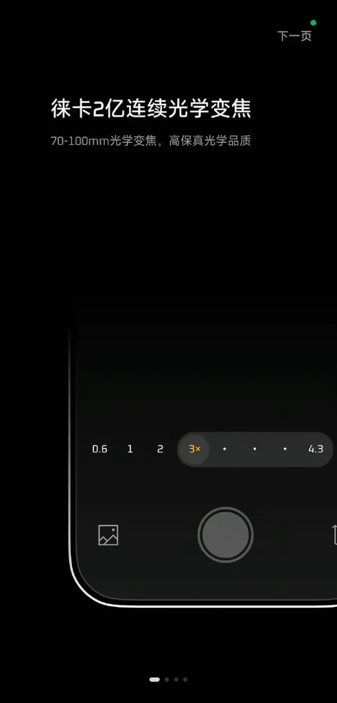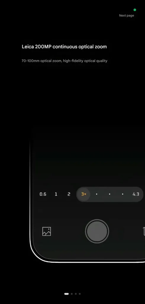 لیست حالتهای بزرگنمایی شامل ۰.۶ برابر، ۱ برابر و ۲ برابر است، اما نکته مهم پشتیبانی از زوم اپتیکال ۳ تا ۴.۳ برابر است که معادل فاصلههای ۷۰ تا ۱۰۰ میلیمتر بوده و حالت ۸.۶ برابر هم دیده میشود. همکاری با لایکا و عبارتهایی مانند continuous optical zoom و high-fidelity optical quality نشان میدهند کیفیت زوم نسبت به گذشته ارتقا یافته و بدون افزایش گستره، دقت را بالا میبرد.
