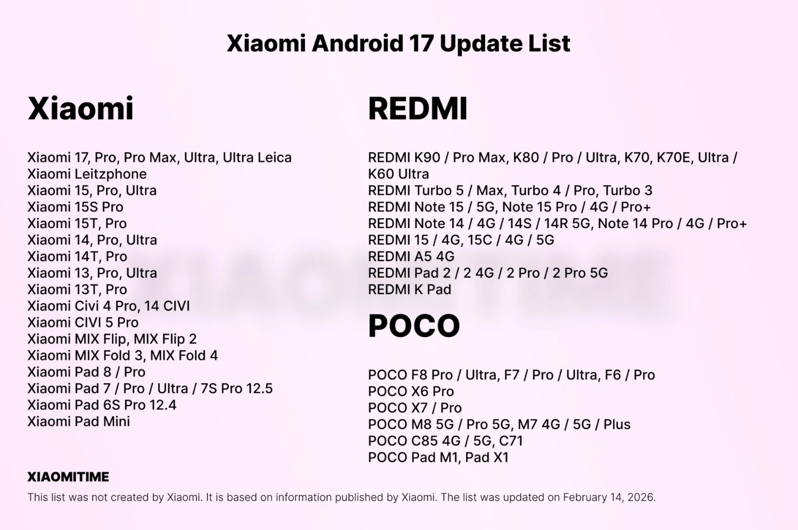 بر اساس اطلاعات درجشده در صفحه رسمی AER شیائومی، این فهرست شامل تمامی مدلهای احتمالی از برندهای زیرمجموعه از جمله ردمی و پوکو نیز میشود. منابع منتشرکننده تأکید کردهاند که دادههای گردآوریشده مستقیماً بر پایه اطلاعات رسمی موجود تنظیم شده و به همین دلیل میتواند تصویری نسبتاً دقیق از برنامه بهروزرسانی آینده ارائه دهد.