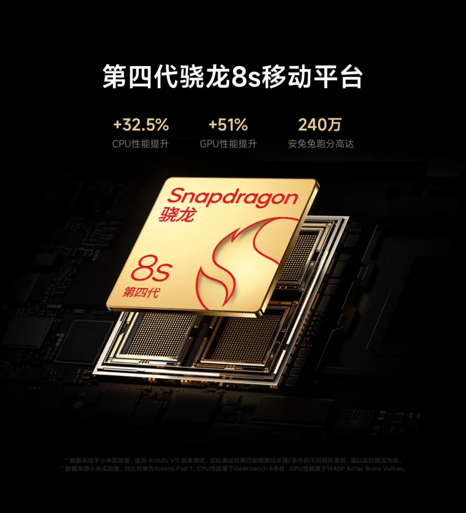 بر اساس بنچمارک‌ها، Snapdragon 8s Gen 4 حدود ۵۰ درصد عملکرد بهتر نسبت به نسل قبل ارائه می‌دهد. به‌نظر می‌رسد نمایشگر شیائومی پد ۸ تغییری نکرده و همچنان همان پنل ۱۱.۲ اینچ IPS با وضوح ۳۲۰۰×۲۱۳۶ پیکسل (نسبت ۳:۲)، نرخ نوسازی ۱۴۴ هرتز و روشنایی ۸۰۰ نیت را دارد. در مقابل، ظرفیت باتری از ۸۸۵۰ میلی‌آمپرساعت به ۹۲۰۰ میلی‌آمپرساعت افزایش یافته و همچنان از شارژ سیمی ۴۵ واتی پشتیبانی می‌کند. وزن دستگاه نیز اندکی کاهش یافته و به ۴۸۵ گرم رسیده (در برابر ۵۰۰ گرم در نسل قبل). ضخامت هم از ۶.۲ میلی‌متر به ۵.۷۵ میلی‌متر کاهش یافته است. با این حال، دوربین‌های ۸ مگاپیکسلی سلفی و ۱۳ مگاپیکسلی اصلی بدون تغییر باقی مانده‌اند.