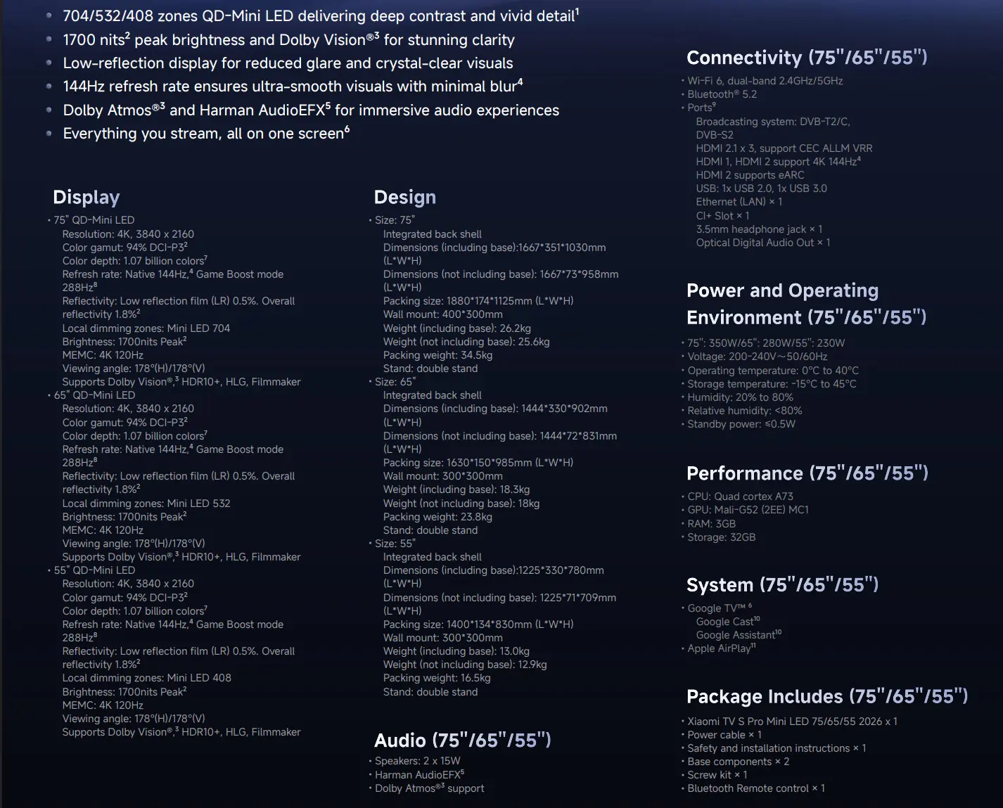 یکی دیگر از نقاط ضعف نسخه جهانی، نرخ نوسازی است که در حالت Game Boost تا ۲۸۸ هرتز میرسد، در حالی که نسخههای چینی تا ۳۳۰ هرتز بازاریابی شدهاند. با وجود تمام این پسرفها، مدلهای جهانی همچنان برای یک تجربه سینمای خانگی پیشرفته مناسب هستند. پنلهای QD Mini LED این سری پوشش ۹۴ درصدی فضای رنگی DCI P3 را ارائه میدهند و با پشتیبانی از HDR10+، HLG و Dolby Vision رنگهایی غنی و جزئیاتی واقعگرایانه به نمایش میگذارند. موتور پردازش تصویر Visual Engine Pro هم بهبود بیشتر کیفیت تصویر را وعده میدهد و نمایشگر با فناوری ضدبازتاب طراحی شده تا بازتاب نور محیط به حداقل برسد.